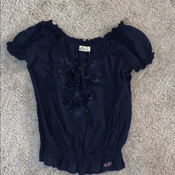 Navy blue short sleeve blouse that can be worn either on or off the shoulders!