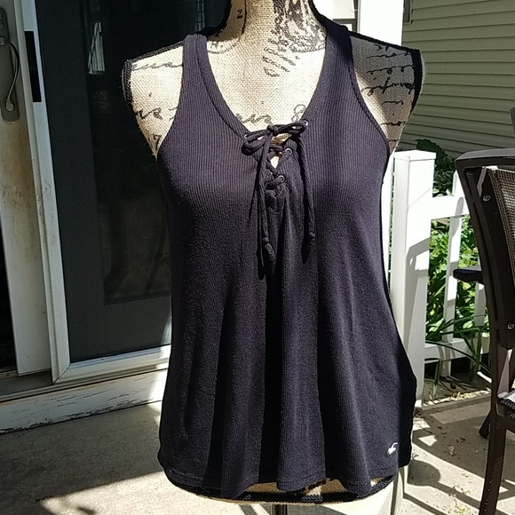Hollister Tank Top with flowing bottom V-neck is flattering and has cute tie detail Black Small Polyester Viscose mix Good condition