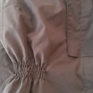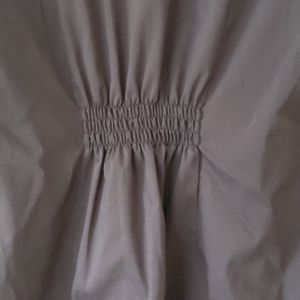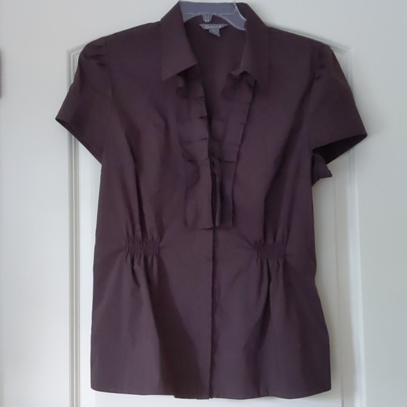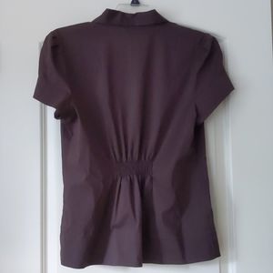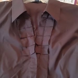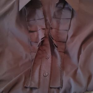 Dark chocolate brown cotton/polyester/spandex blend materials, front and back elastic waist gather, tuxedo ruffle front with hidden button closure.