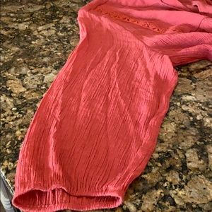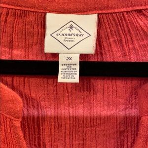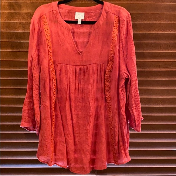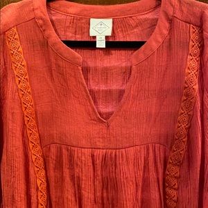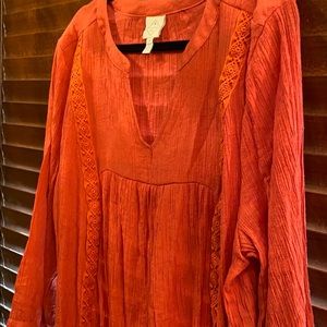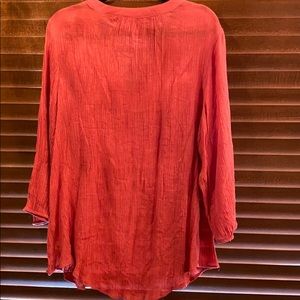 Light gauzy top with v - neck and elastic cuffs on 20” sleeves. Beautifully embroidered detailing. The orange color is eye catching and it’s so easy to pair with jeans or white skinny pants. 31” from shoulder to longest part of the hem. 23.5” from pit to pit relaxed.