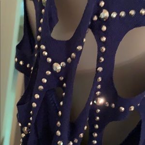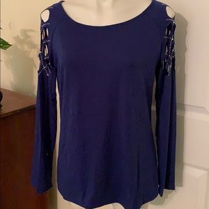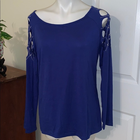 NWOT Sparkle all day and night in this royal French blue top. The open work shoulders are encrusted with lots of glam rhinestones to light up your event! Length is just as we like it, to the hip line! Long sleeves will keep you comfy in cold buildings in summer . It is a year round beauty !
