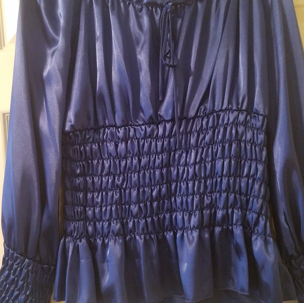 Light satiny long sleeve fashionable blouse. Never worn, ties in front.