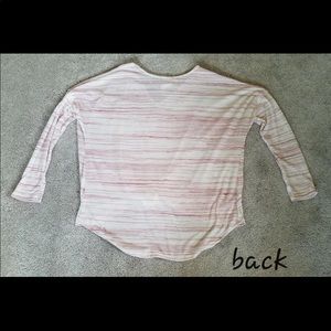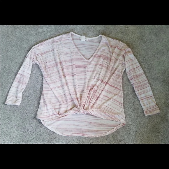 Peach and white tip with knot in front. Great for covering up area of the stomach some of us ladies want to hide :-) Cute and comfy. Great condition