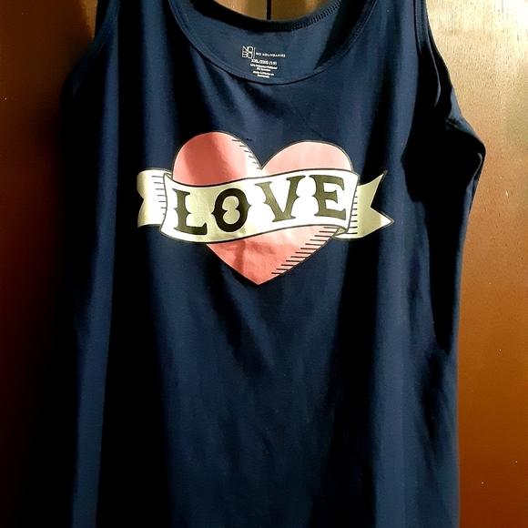 Navy blue tank with love graphic in pink and white. Very stretchy.