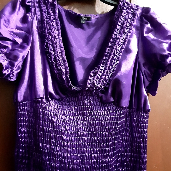Satin w/ special detail around the neck and bodice. Never worn.