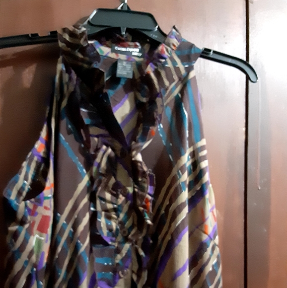 Brown sleeveless top with tuxedo ruffles down the front and around neck area. Real buttons, colorful and elastic around the bottom.