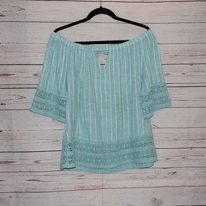 NWT! Solitaire turquoise off shoulder top. Size M. 3/4 sleeve. Eyelets around sleeve/front/hem. Cut out at neck. No stains or picks on fabric. Excellent condition!
