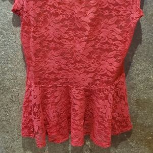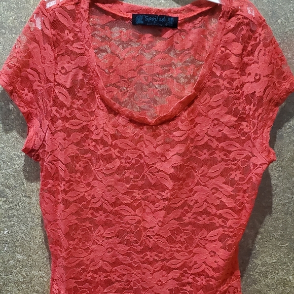Sexy lace 😍 fitted tangerine top! Flows out at the bottom. Perfect with colored cami under.