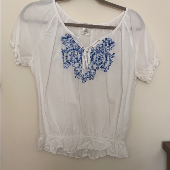 White cinched waist with blue embroidery