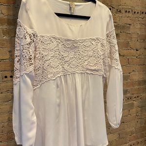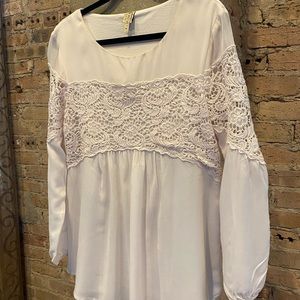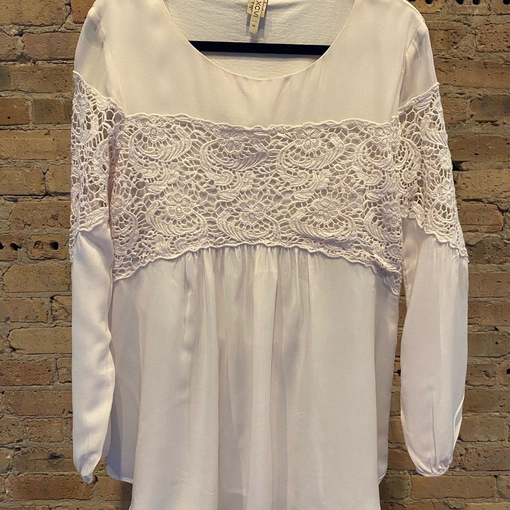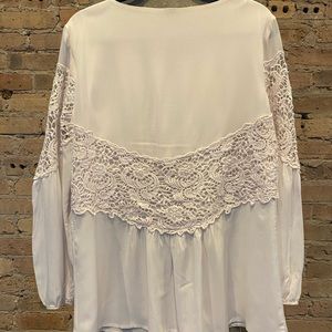 Romantic lace and rayon floaty top. Sheer long full sleeves with lace at upper arms. Body fully cotton lined. Very comfortable and pretty. Gathered pleats under lace inset bodice and in back. Lace dips for movement in back. Runs a bit large.