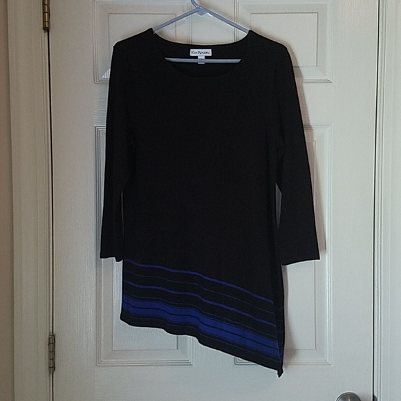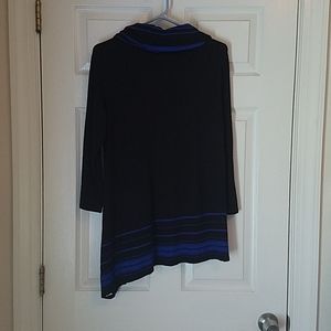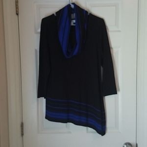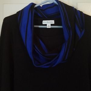 Very nice pull over (any season) sweater with detachable scarf. Left side longer than right. 70% rayon, 30% polyester.