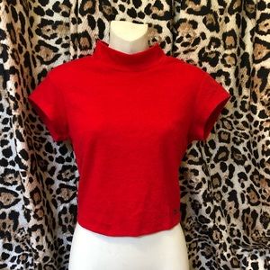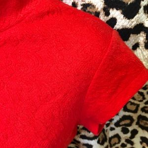 Mid Red Guess short sleeve Top with imprinted flower like design. Open back. Covered neck. Size M