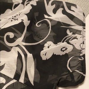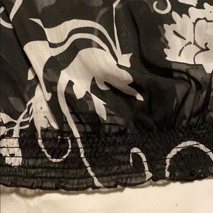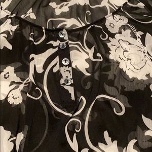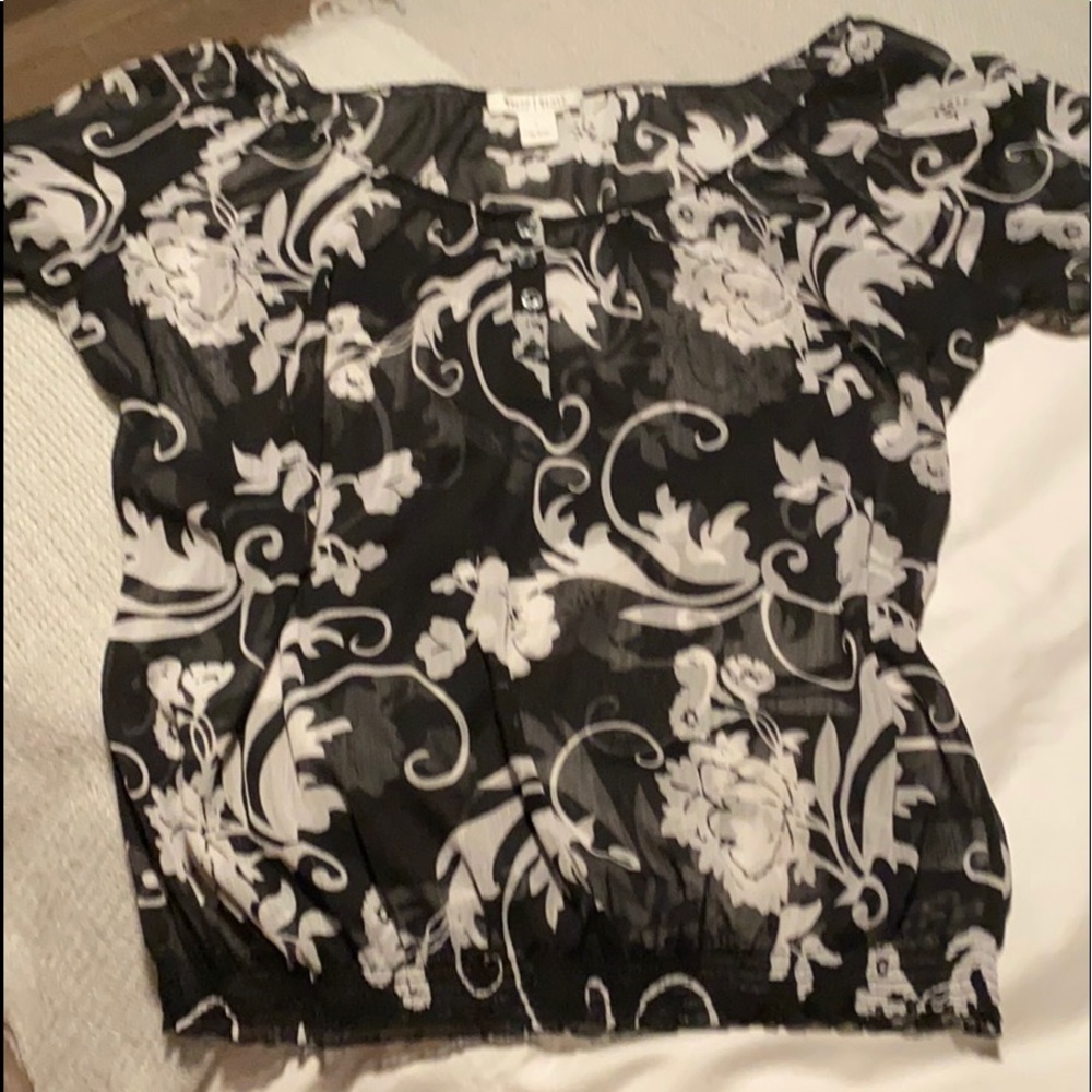 Short sleeve sheer top. Perfect for a dressy or casual summer night. Need to wear a cami or tank underneath. Couple snags but hard to see on the black and white floral print.