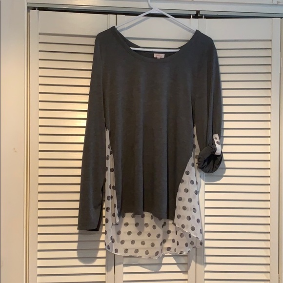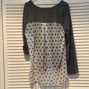 Polyester, rayon, spandex blend with sheer polka dotted material on the back. Worn only a few times.