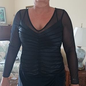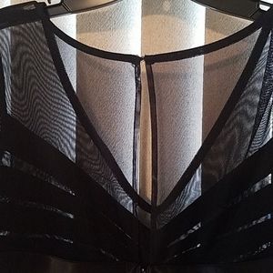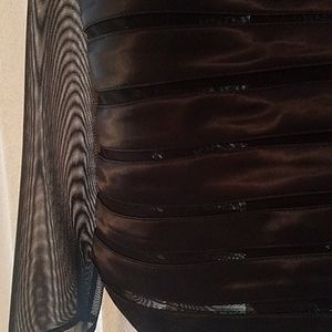 Sheer net and satin. Zipper back. Vneck in front, clasp at neck in back.
