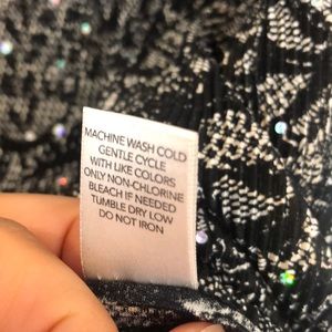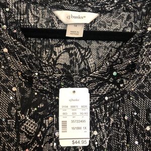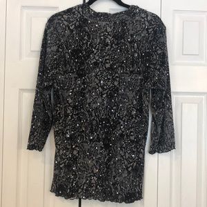 Size says 1X but fits like a Large. Perfect New Year’s Eve top! Dressy, light weight black top with white patterning and sparkle sewn in. 3/4 sleeve, 100% polyester. Never been worn.