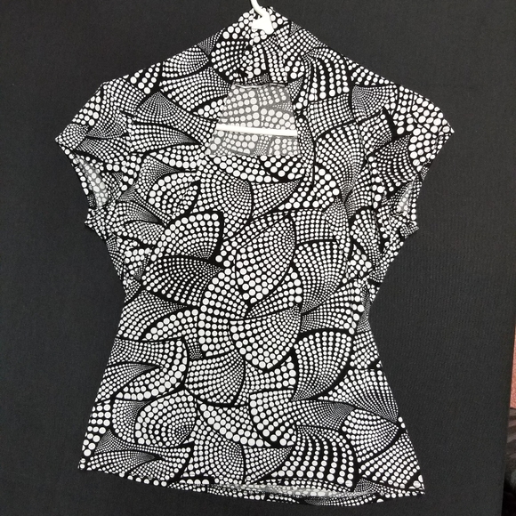 Fitted geometric patterned top. Stretch fabric. Cut out neckline.