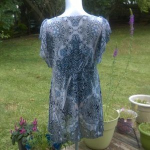 Black and grey abstract patterned top with beaded yoke; flutter sleeves
