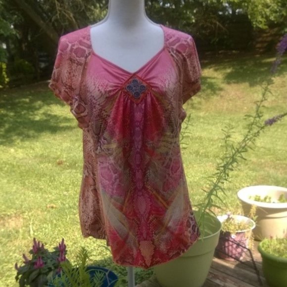 a. Coral, pink, burgundy abstract patterned top with flutter sleeves with an with embroidered decal on the yoke or