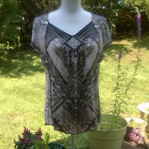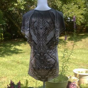 b. Black and grey abstract patterned top with flutter sleeves with an with embroidered decal on the yoke