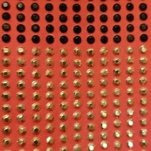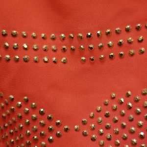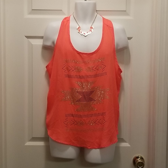 Neon orange top with tribal studded gold and black design. 100% Polyester. Semi- sheer. Small stud missing as pictured, but not noticable.