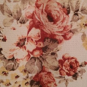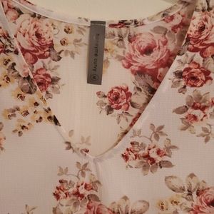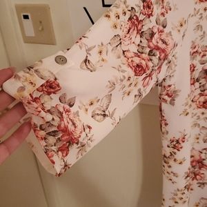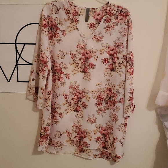 V neck tunic style top with pink floral. 3/4 sleeves with tabs. Never been work. 97% polyester 3% spandex.