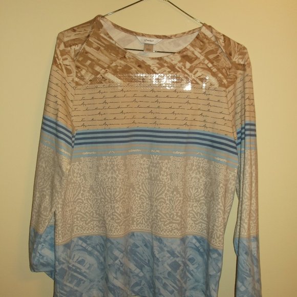 Tan and blue and gray long sleeve top. Has many nice details. Never worn. 95% cotton and 5% spandex