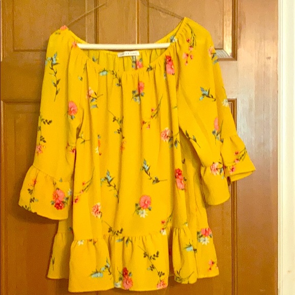 Yellow top with ruffle around bottom and sleeves. It also has flowers.