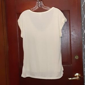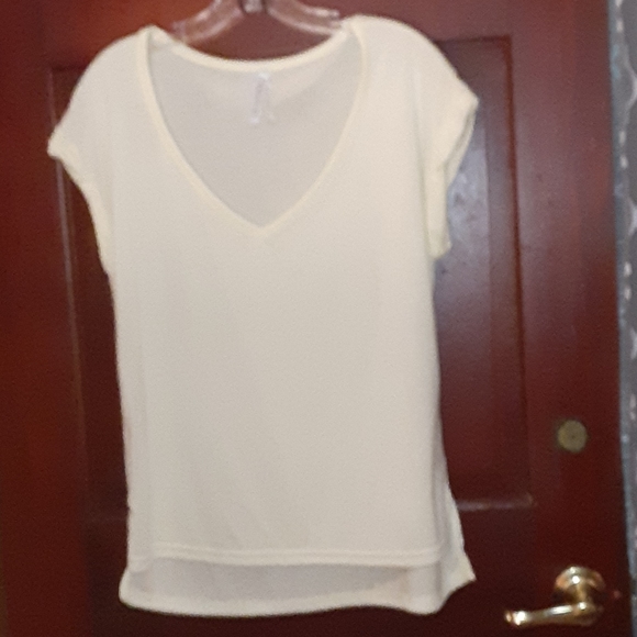 Short sleeve t-shirt like material very comfortable like the new v neck the color is light yellow.