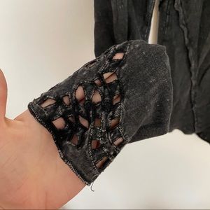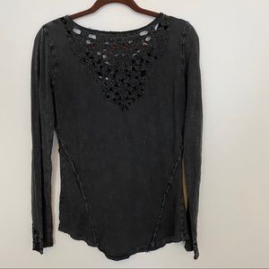 I’m excellent condition, no flaws but a couple loose threads. Adorable black long sleeve shirt with lace detailing.