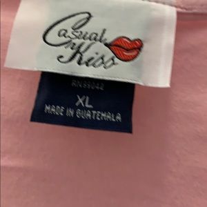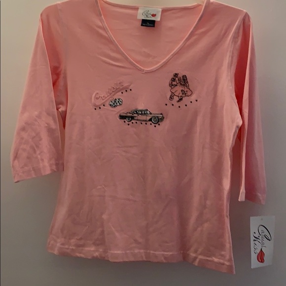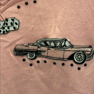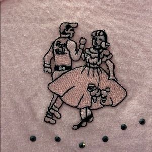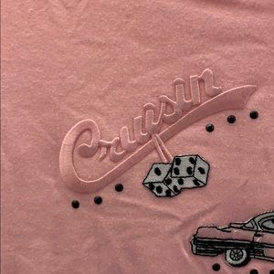 Pink knit top embellished with embroidery Cruisiin with dice rock & roll dancers and a car also black rhinestones marked xl but runs small more like a large never worn