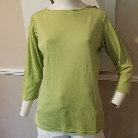 Sage green 3/4 length sleeve (19" from shoulder) knit top. 22" from neckline to hem. 60% cotton 40% polyester blend. Machine wash gentle.