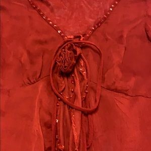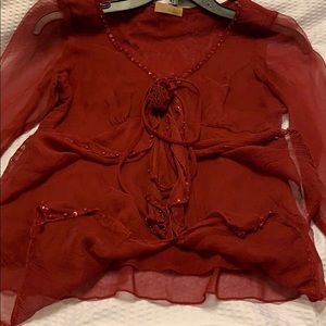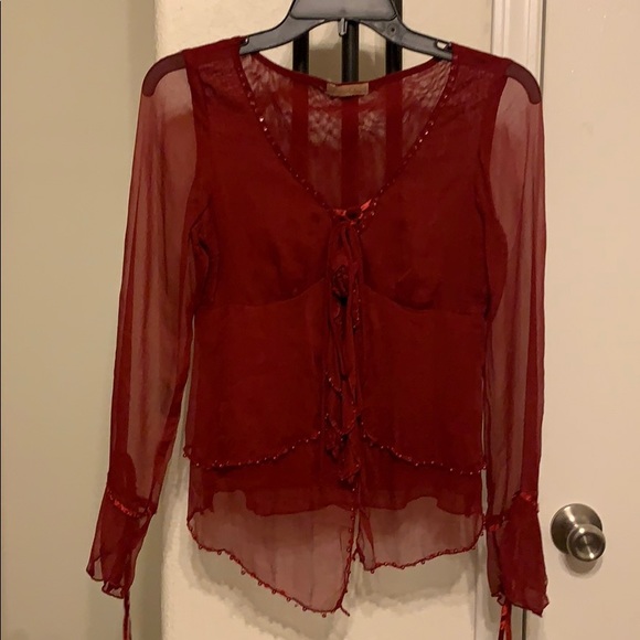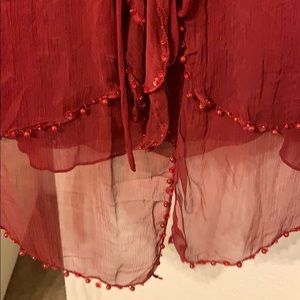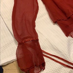Very sheer sexy burgundy long sleeve dress top. Ruffles/ ribbon/beaded accents. Gorgeous and flattering on!