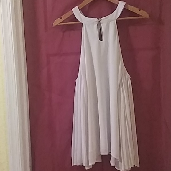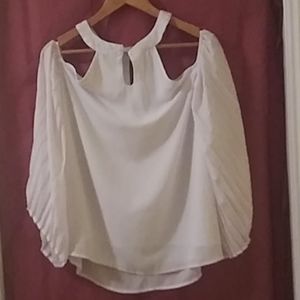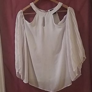 Silk white top angel wing sleeves open shoulder. Worn once a little spot around the neck line barely noticeable.