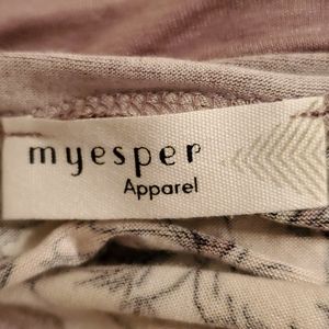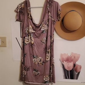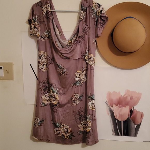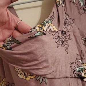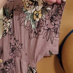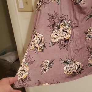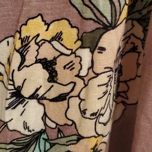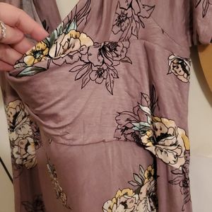 Flowy soft fabric with a pretty floral design. Scoops down in front and back. Short sleeves. Brand new. Never worn. 95% rayon 5% spandex light plum background