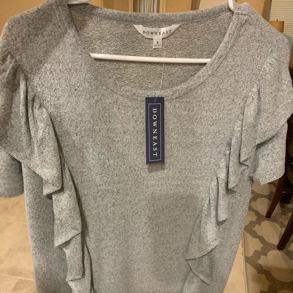 Grey top with ruffles on each side of the front of the top. Size Small. Sweater type top.