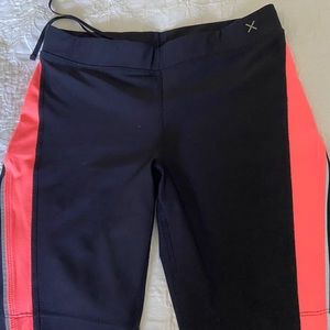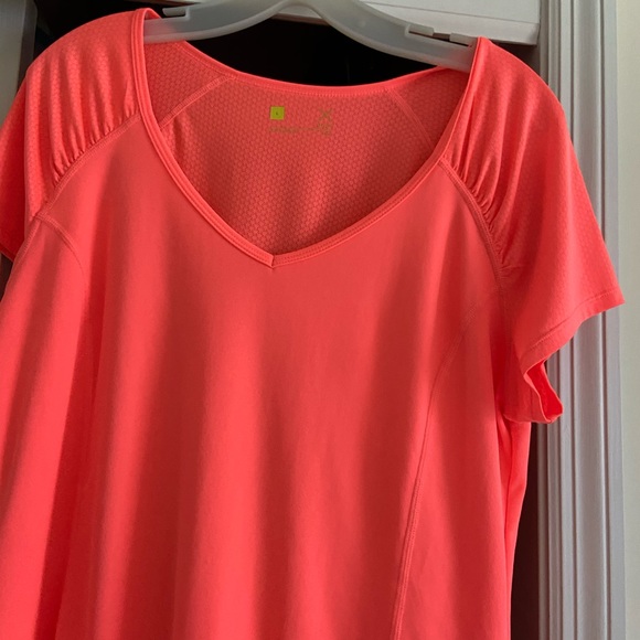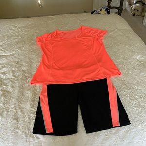 Gorgeous bright tangerine top with matching bike shorts comfortable breathable fabric. Top has a shirred effect on short sleeve. Bike shorts have zipper in the back Top large shorts medium both brand new never worn