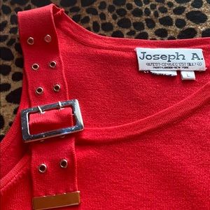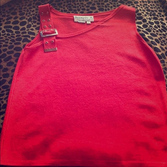 This super cute red top has spandex like material with a belt buckle type shoulder strap.