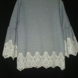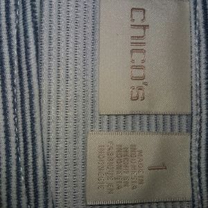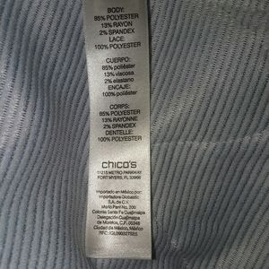 Navy and white lace trimmed top. Just worn one time. Too fru-fru for me, but it's a beautiful top. Can't find a size 1in the choices, but it's a Chico's size 1.