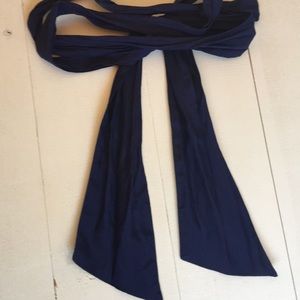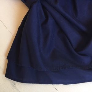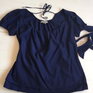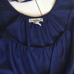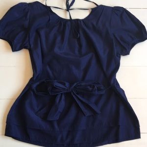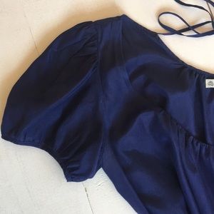 Beautiful cotton and silk blend fabric with slight sheen. Double layer fabric through back and front. Deep Demi style scoop neck and back Short puffed sleeves Long waist tie sash , to be tied around or in the back, but can be worn without. Lovely rich royal blue color with a purple undertone. Mid hip length.
