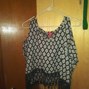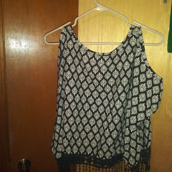 Black and tan top with cropped sleeves. Fringe on bottom