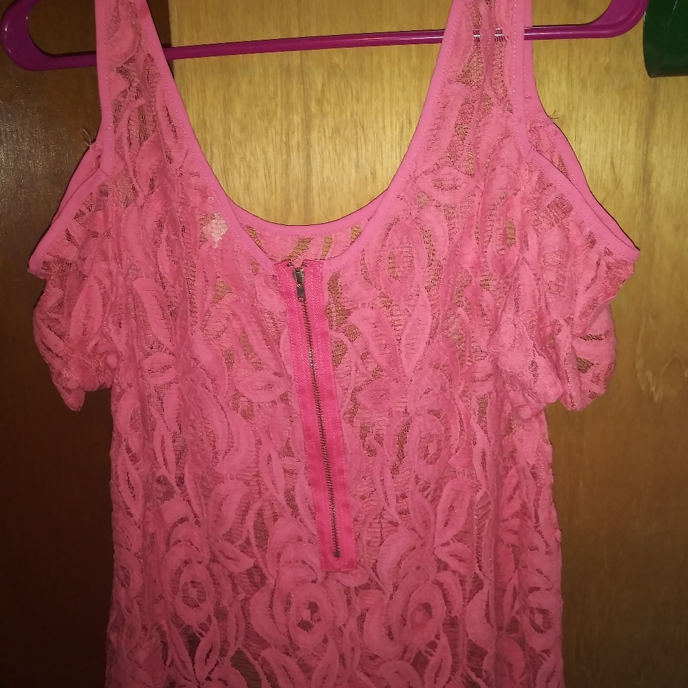 Orange lace top with zipper in back. Cropped sleeves. 100% polyester