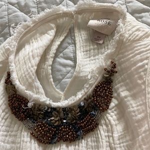 Ivory colored tank with built in beading as necklace. Flowy and lightweight. Can go for many seasons and work appropriate.
