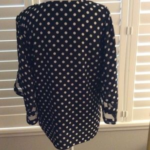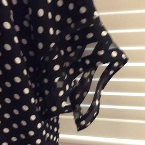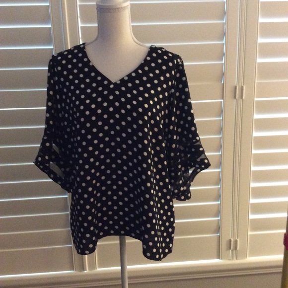V neck,polka dot polyester top,which is longer in back,, the flared sleeves have two rows of netting for interest.Machine washable.