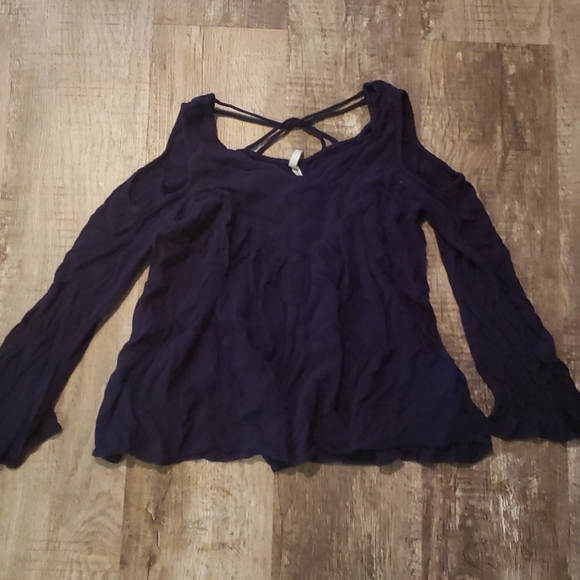 A navy blue top with zig-zag design on the back and showing shoulders