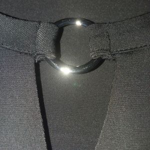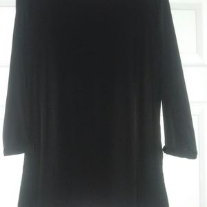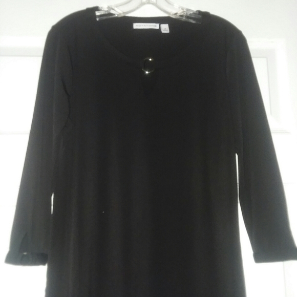 Just a simple black top. Really a nice length. The silver ring at the neck and sleeves dress it up just enough. Perfect for so many things. No tags. Worn one time.
