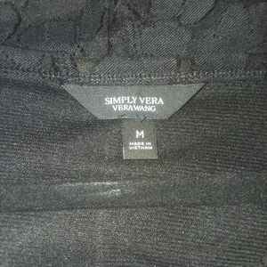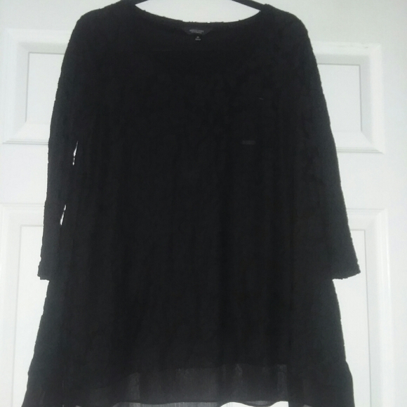 This is really a pretty top. The pictures don't do it justice. A pretty black, lace top with sheer border on the bottom. Body is fully lined. Slightly longer on the sides. Instruction tag is small print on a black tag. Impossible to photograph. Wash in cold water with like colors. No tags. Never worn.