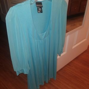 This is one beautiful top. The aqua color is absolutely gorgeous. The fabric is so soft and it just drapes beautifully. The sleeves are slightly sheer. I wanted it so badly I bought the only size they had. Sadly, I'm not a small in this top. No tags. Never worn.