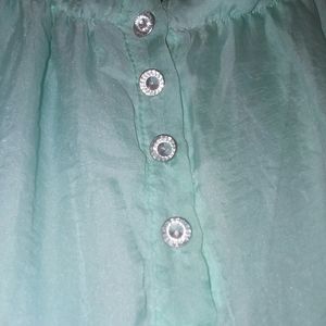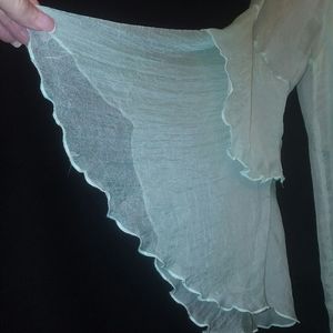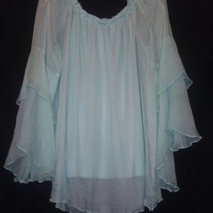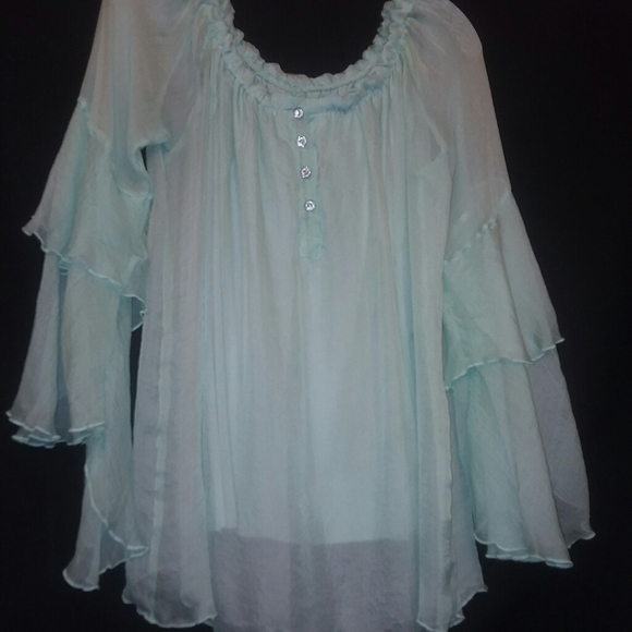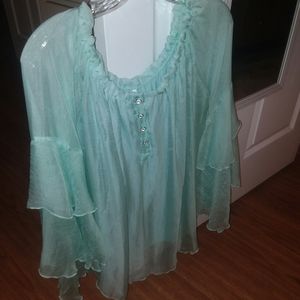 Absolutely gorgeous, feminine top. Can't say enough about this top. It's stunning. So light and just flows beautifully. Sheer, but body is fully lined. Only worn once. It's OS but I'm new to this and don't see the OS choice so marked it S.
