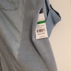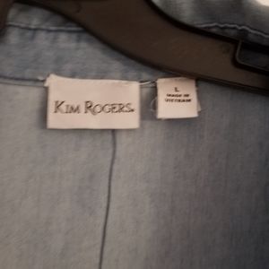 Washed denim, soft and comfortable. Front button, with stretchy side inserts on both sides. Has 3/4 sleeves. This top is NWT, never worn.